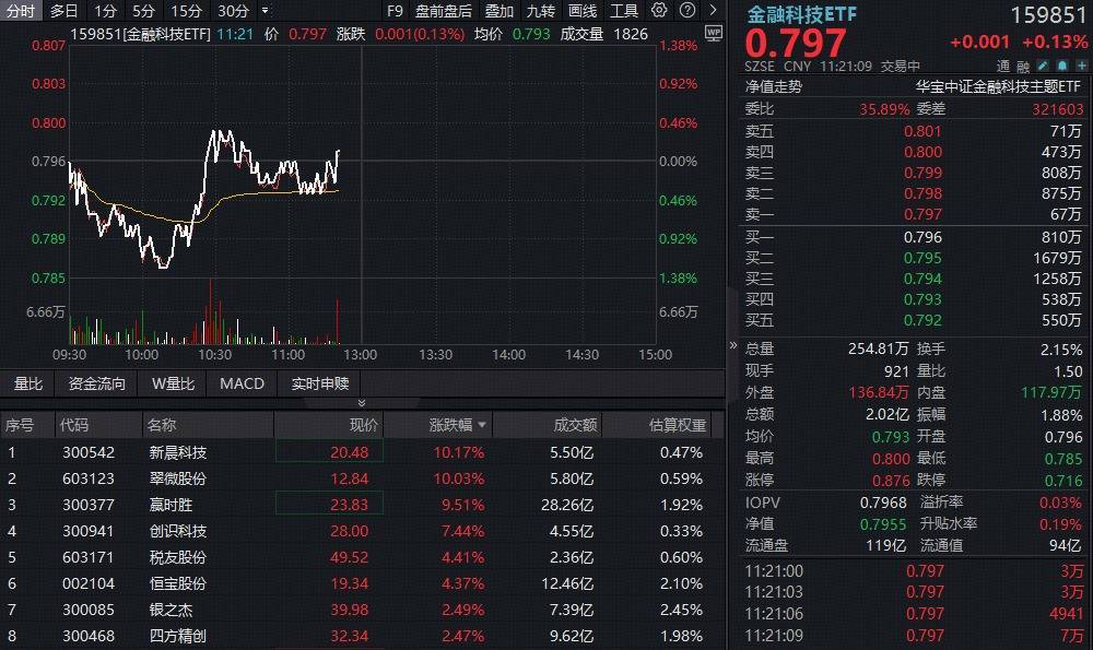 16日早盘,金融科技盘中逆市翻红,翠微股份涨停,赢时胜、新晨科技大涨超10%,创识科技、恒宝股份、税友股份等多股涨超4%。热门ETF方面,同类规模最大的金融科技ETF(159851)场内逆市翻红配资炒股官方注册开户,盘中频现溢价,量能环比放大,表明买盘活跃。